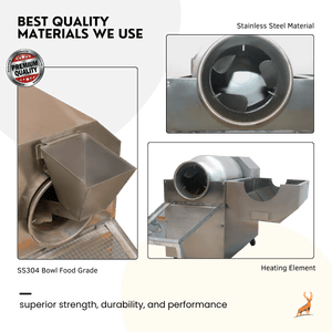 Constructed with Full Body SS304 food-grade Stainless Steel for the bowl and a durable MS body structure, the Electric Nut Roaster is built to last. This robust construction ensures that the machine can handle the demands of continuous operation while maintaining the highest hygiene standards. The stainless steel bowl ensures that the nuts are roasted in a contamination-free environment, crucial for food safety.