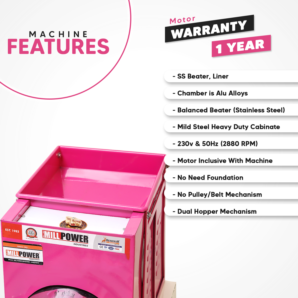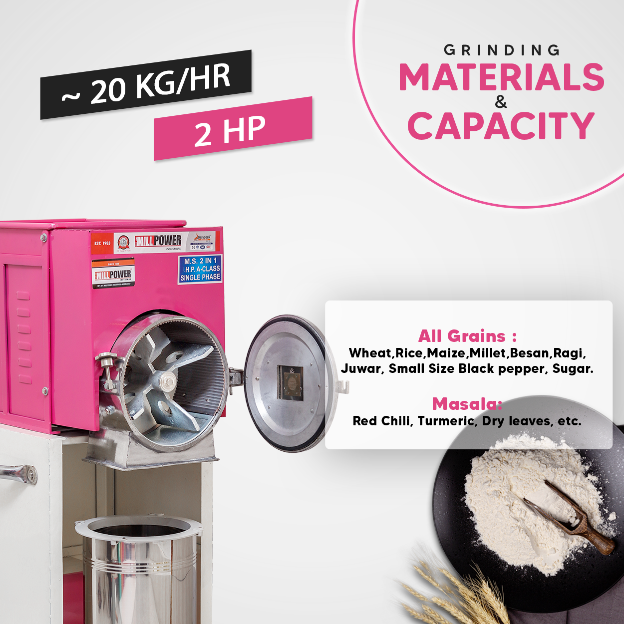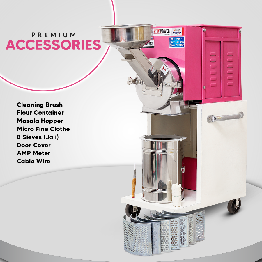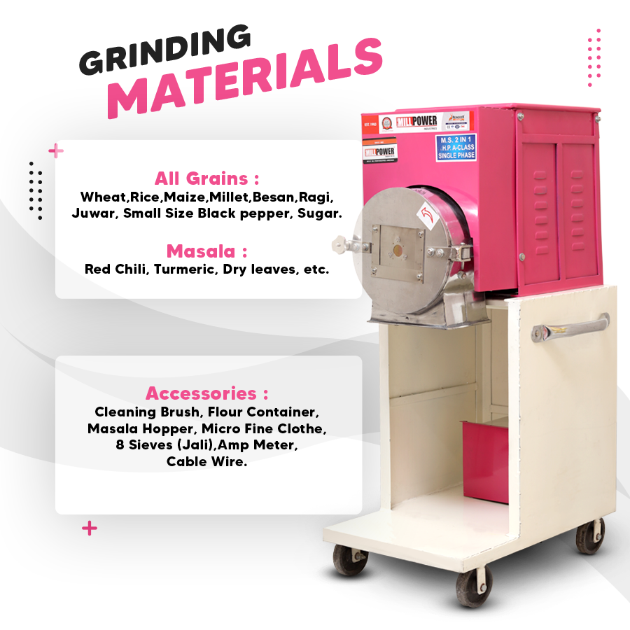 Grinding Materials: All Grains like Wheat, Rice, Maize/Corn, Millet, Besan, Ragi, Juwar, Dal & Small Size Black pepper, Sugar & Few Masala Red Chili, Turmeric, Dry leaves, etc